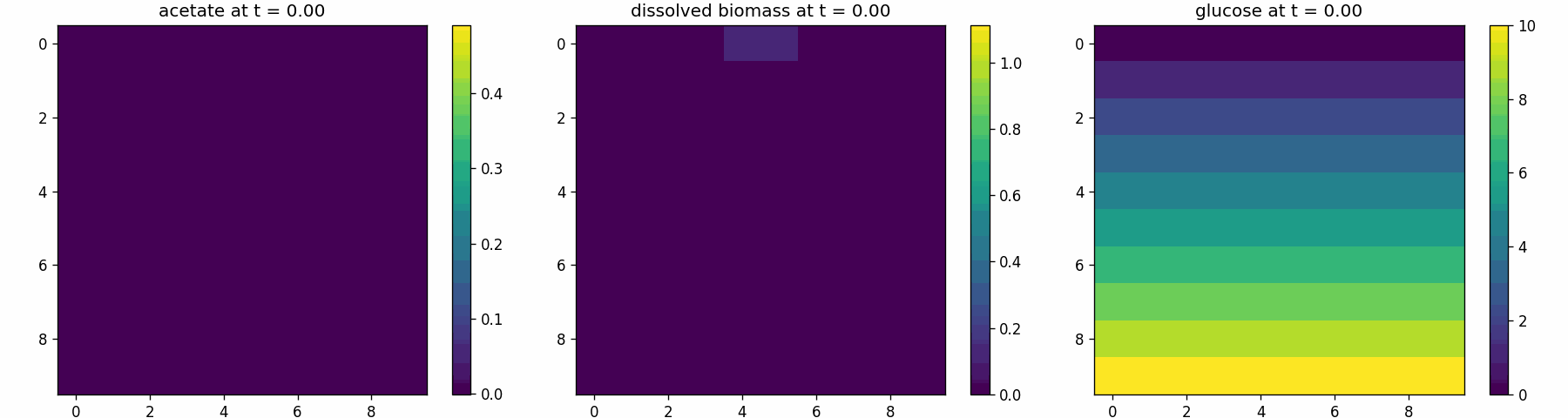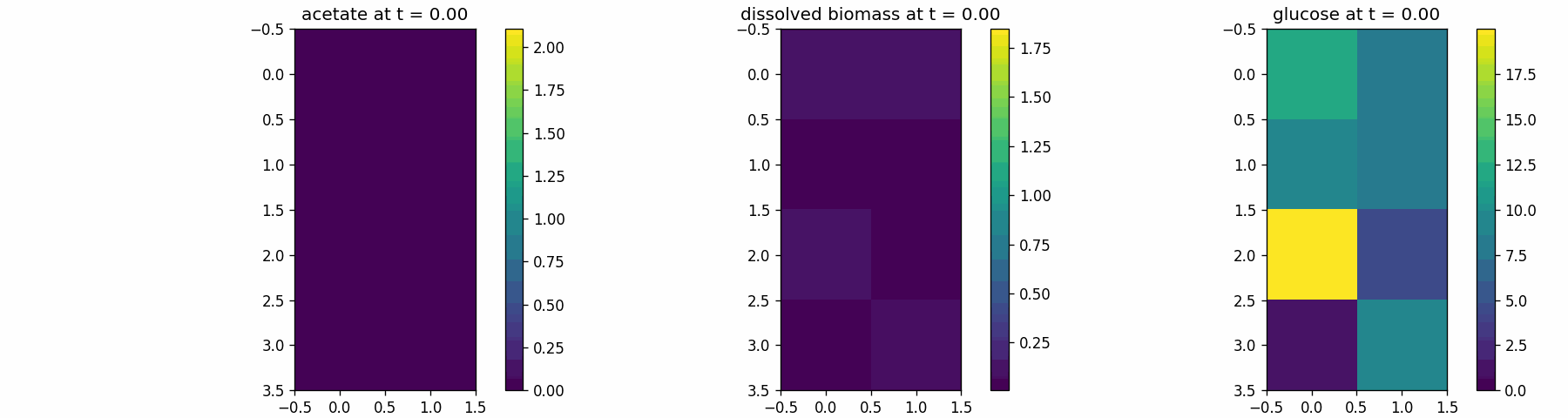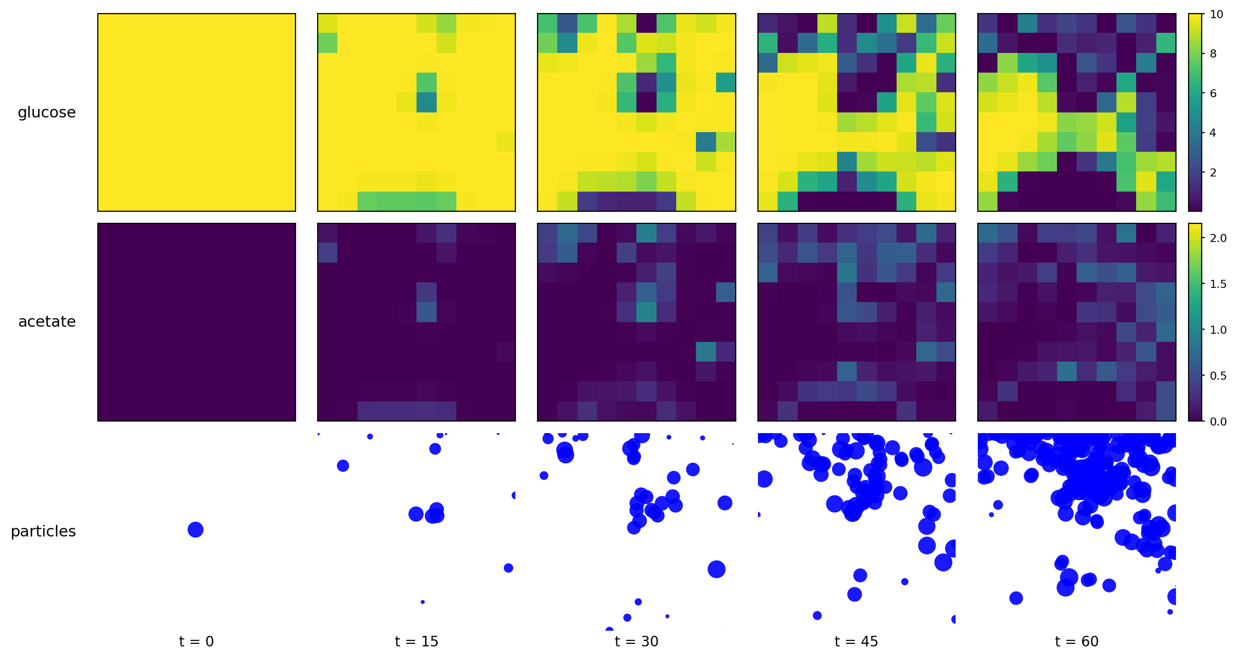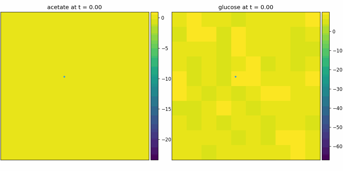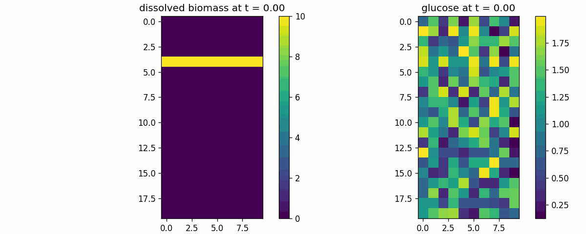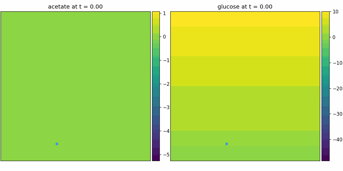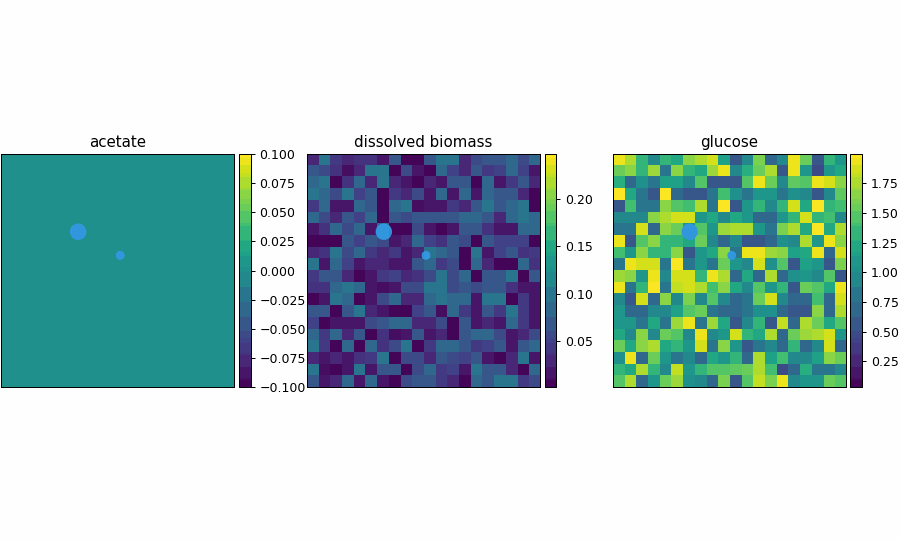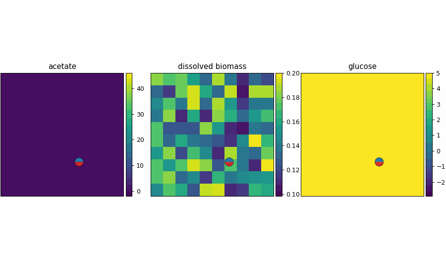 Spatial microenvironment (vectorized dFBA): one spatial dFBA process updates all lattice sites as a single structured state. Demonstrates batched execution + field coupling.