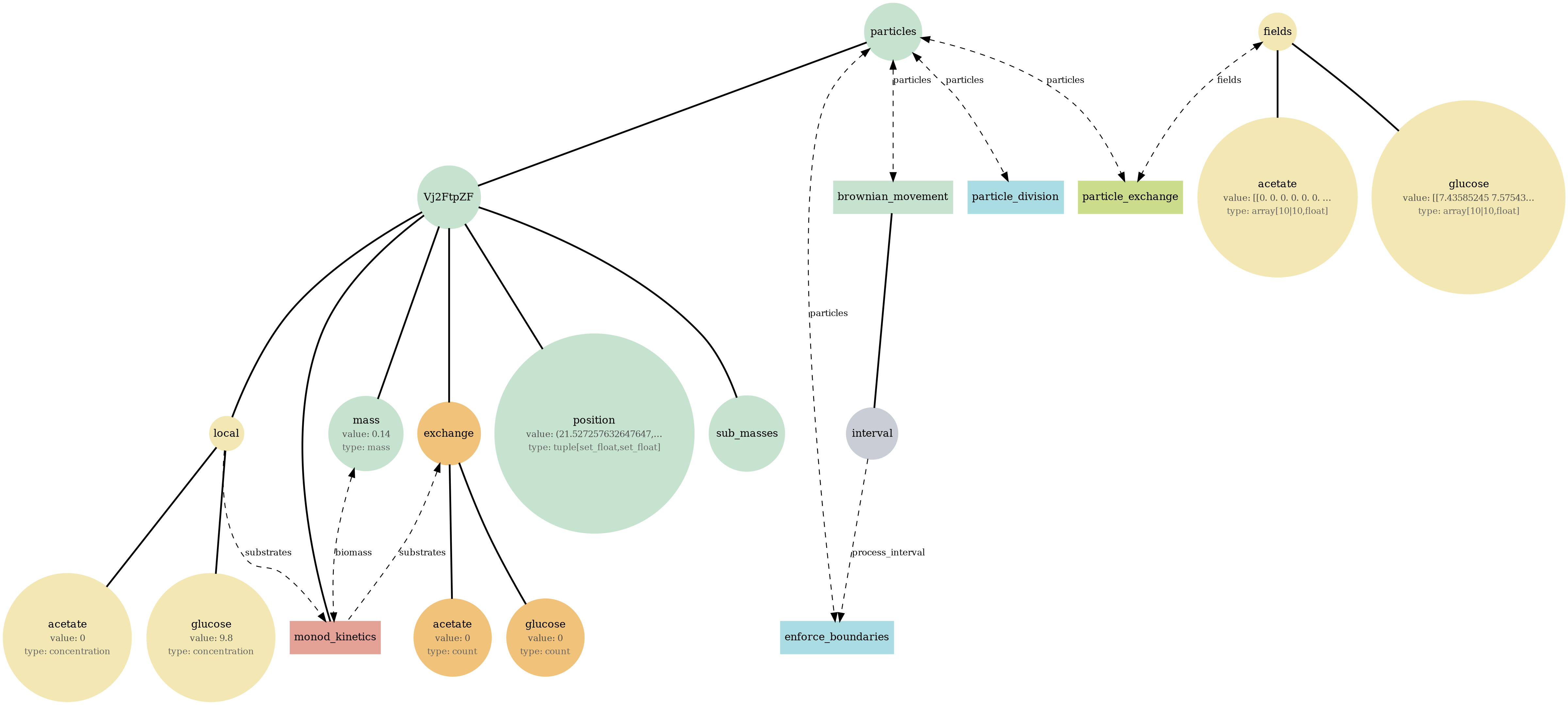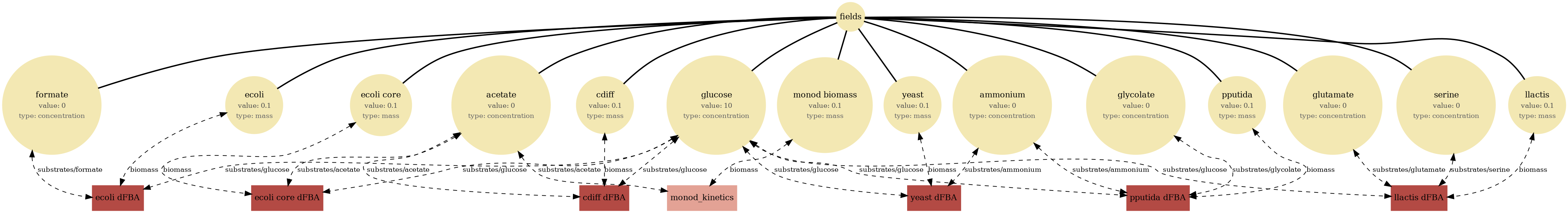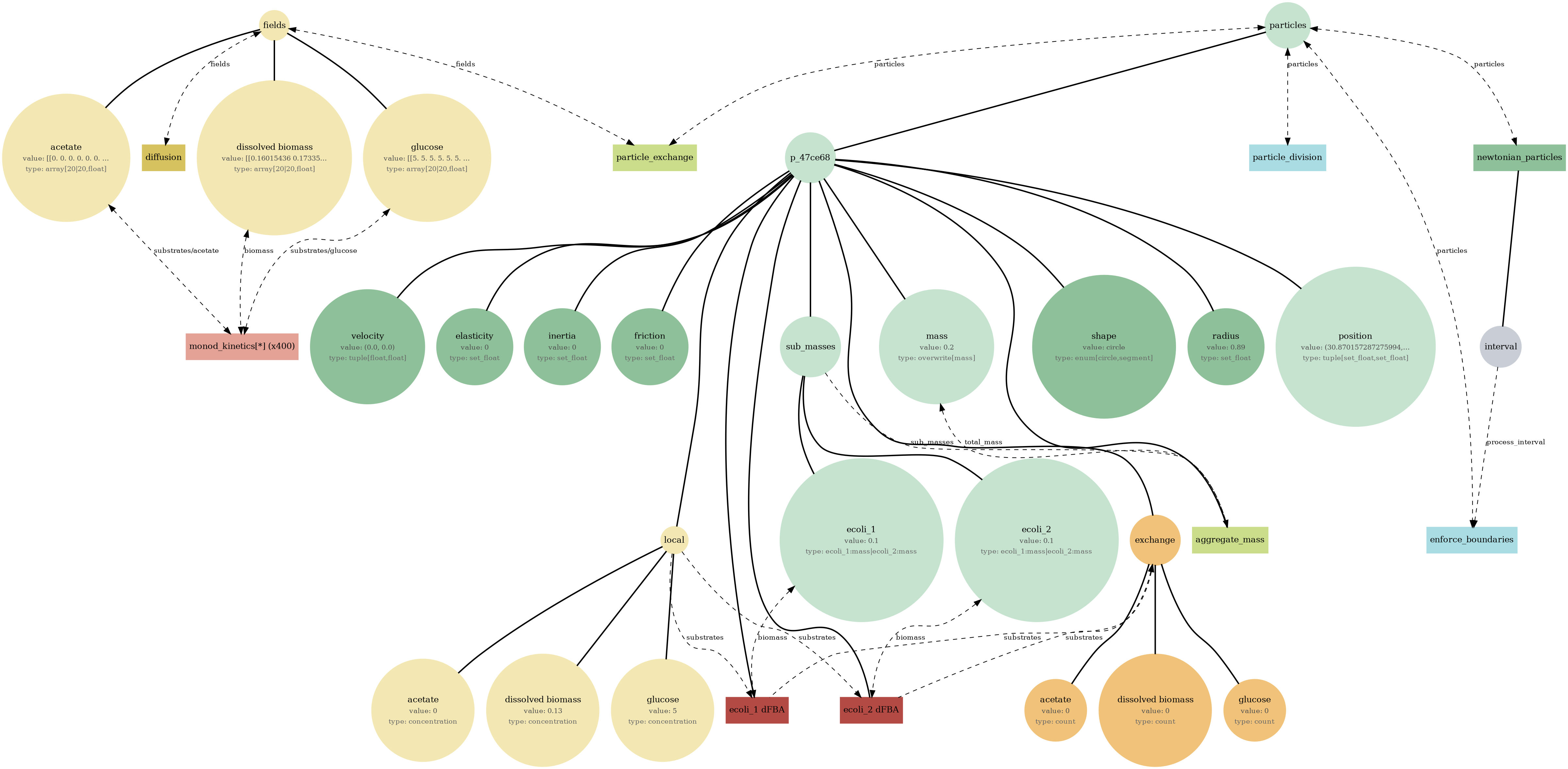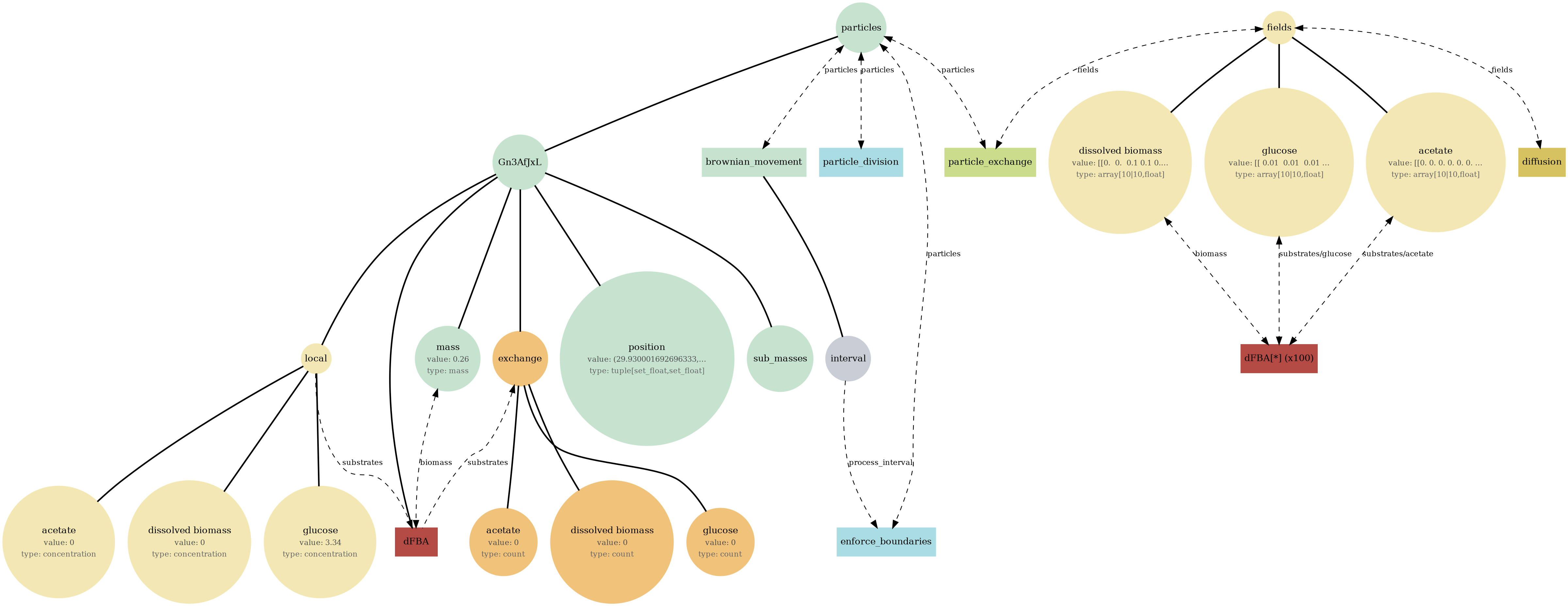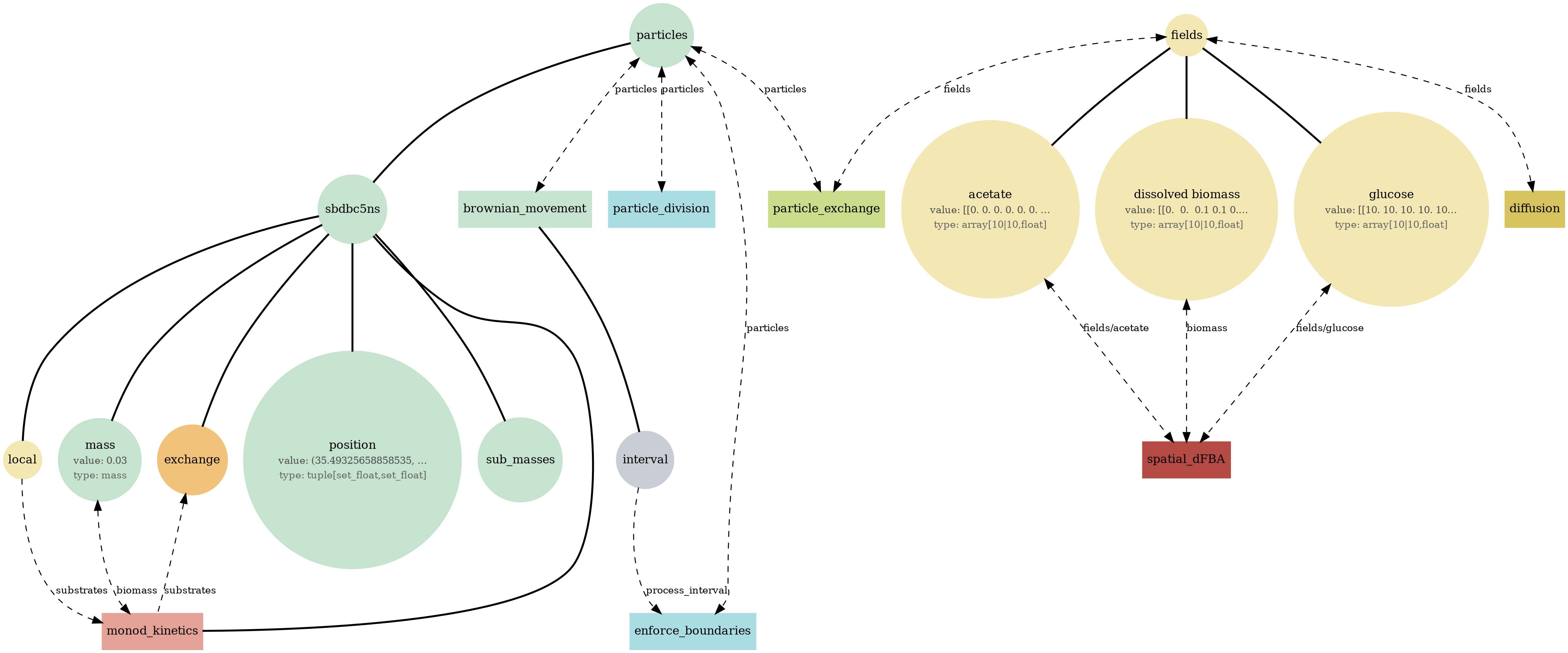 Tip: If a diagram feels busy, focus on one store (fields or particles), then trace only the processes connected to it. The report sections below let you compare structure (bigraph), serialized state (JSON viewer), and behavior (plots/GIFs) side-by-side.
