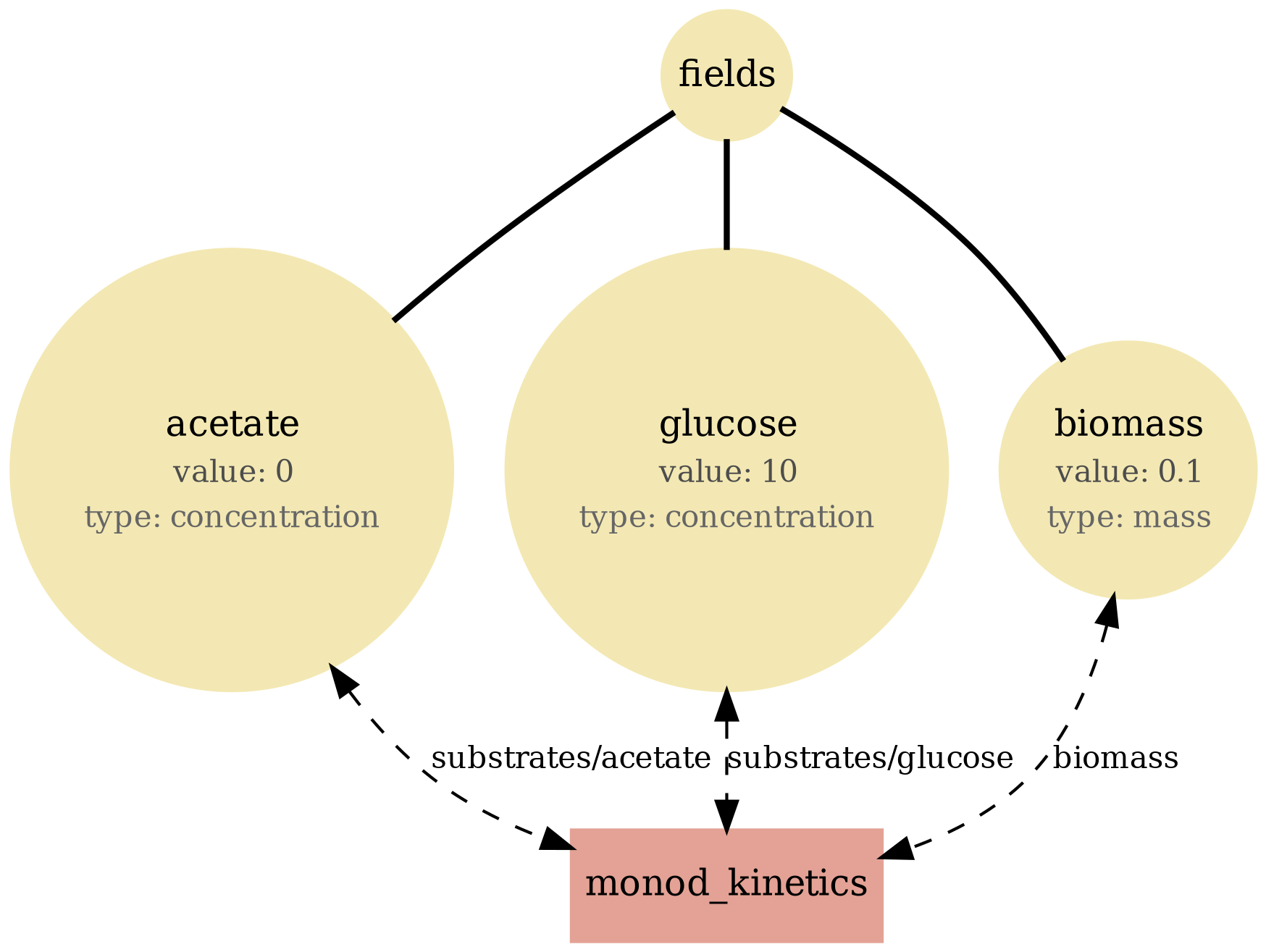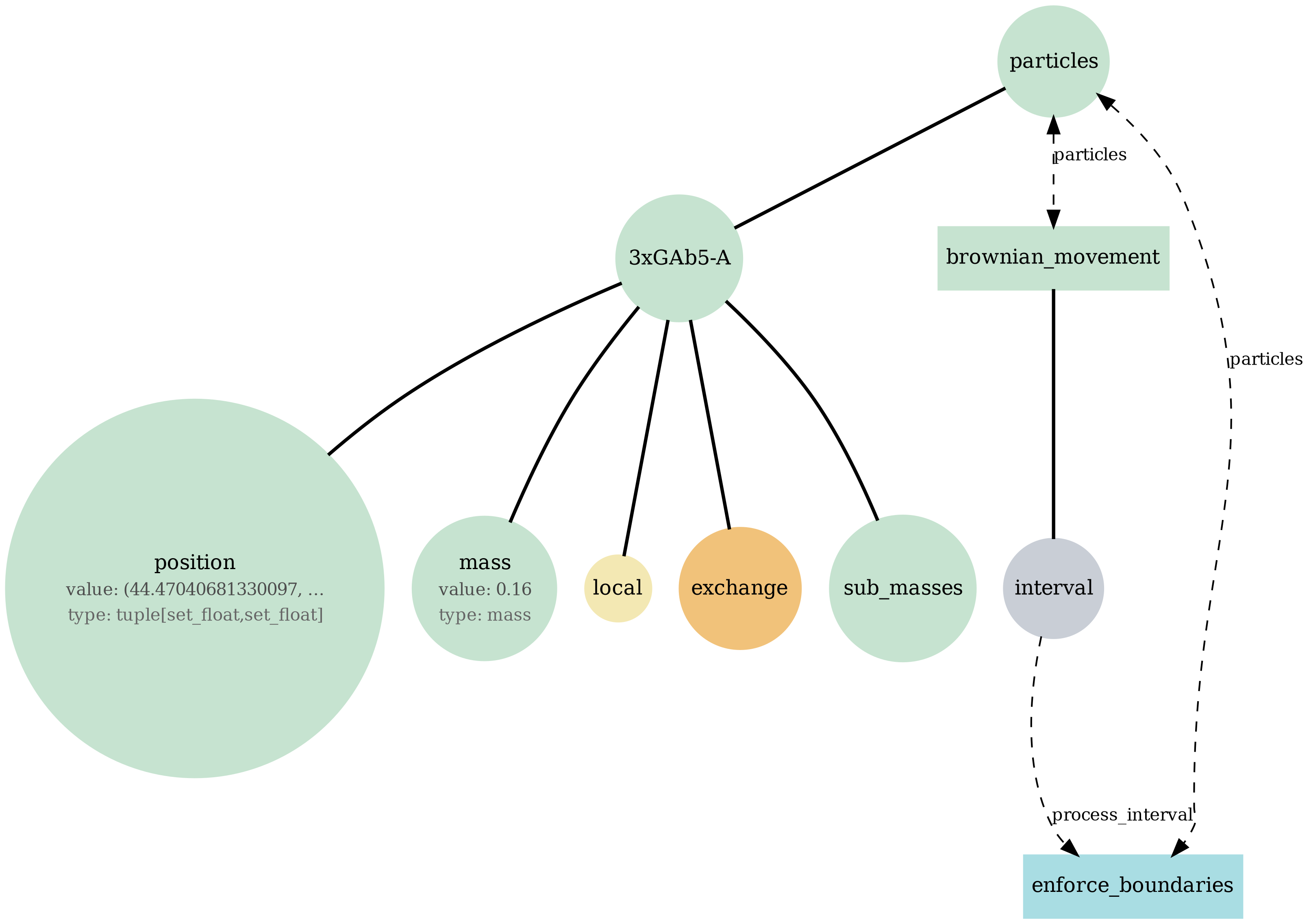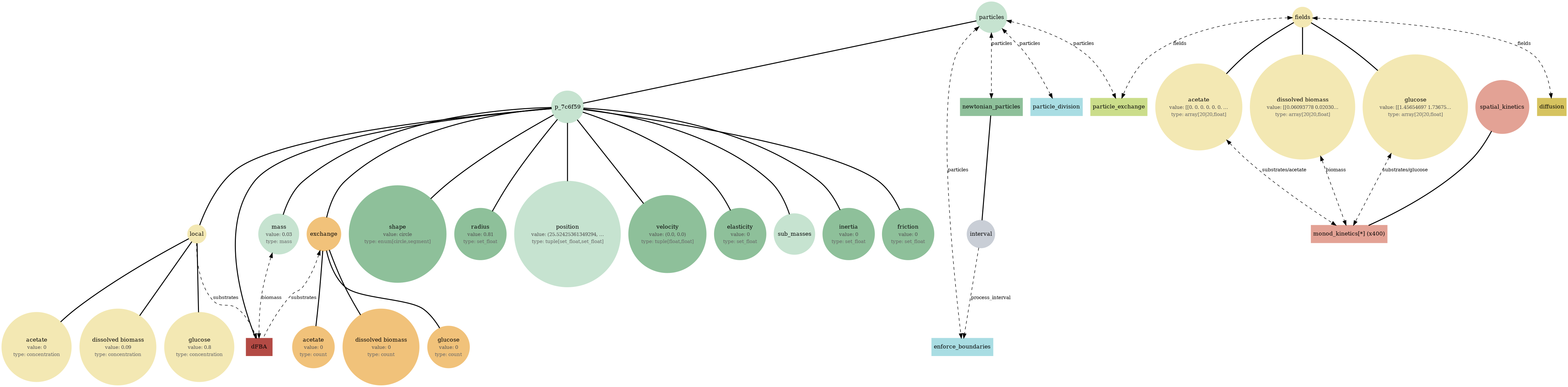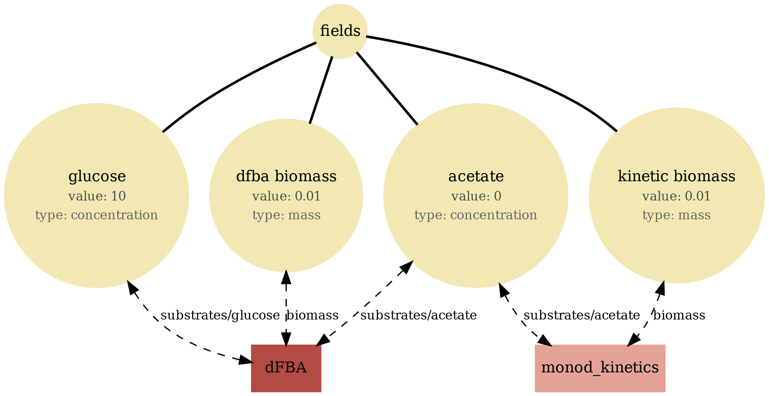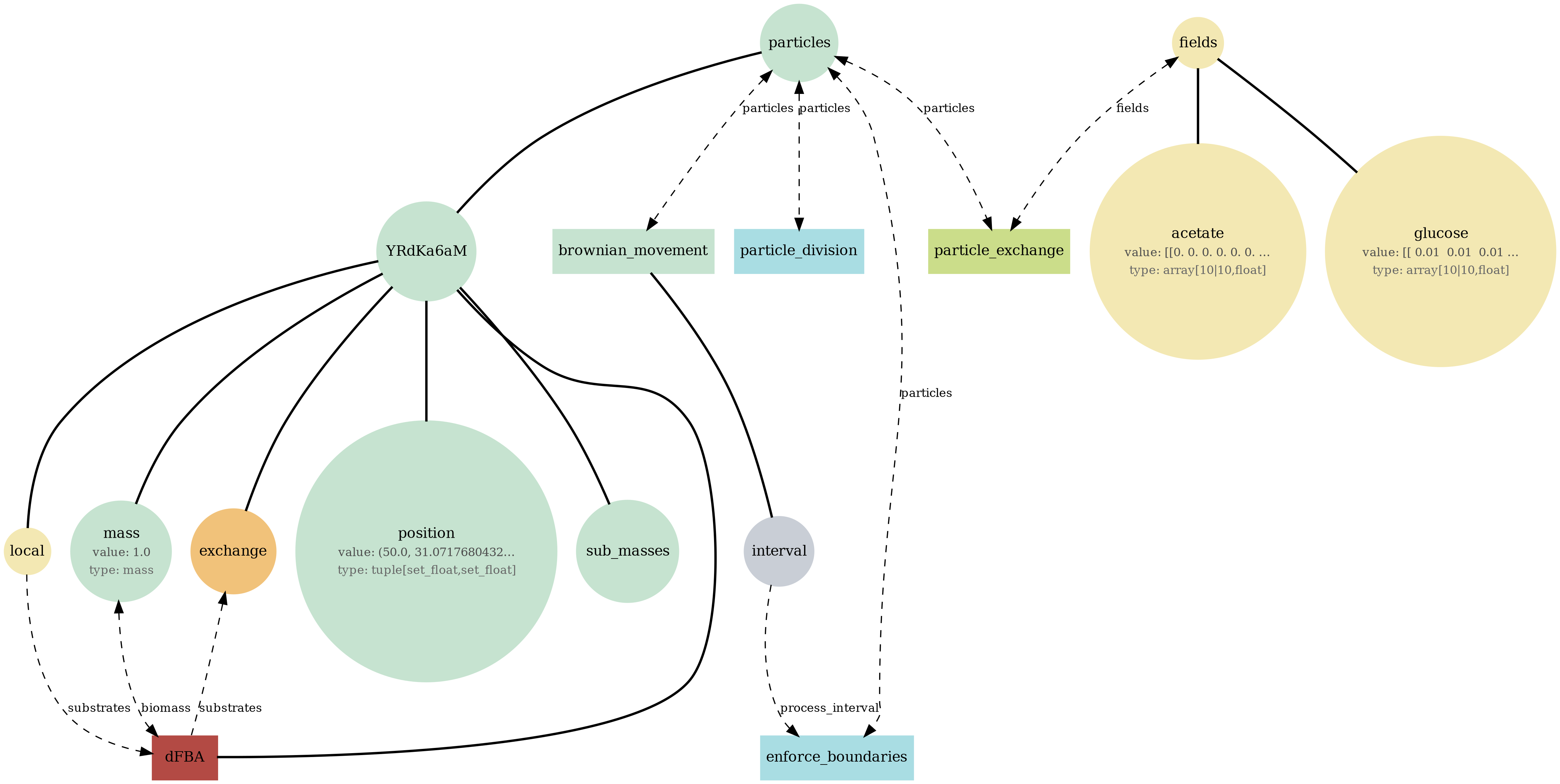 Tip: If a diagram feels busy, focus on one store (fields or particles), then trace only the processes connected to it. The report sections below let you compare structure (bigraph), serialized state (JSON viewer), and behavior (plots/GIFs) side-by-side.
