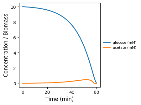 Single-cell metabolism baseline: dynamic FBA for E. coli core with external glucose/acetate and biomass over time (no space, no particles).